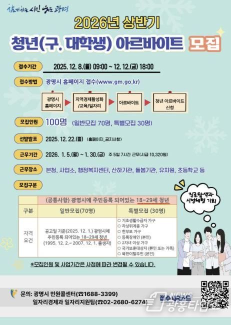 [광흥타임즈 = 조수제 기자] 광명시는 오는 8일부터 12일까지 ‘2026년 상반기 청년 아르바이트’ 참여자 100명을 모집한다.