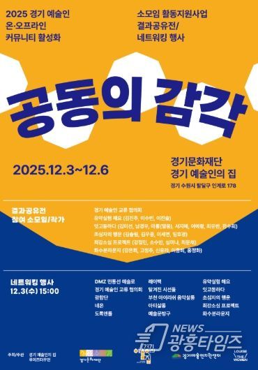 [광흥타임즈 = 조수제 기자] 경기문화재단은 《경기 예술인 온·오프라인 커뮤니티 활성화 소모임 활동지원》 사업의 일환으로, 다양한 커뮤니티 기반 활동의 결과물을 공유하는 ▲《공동의 감각》 결과공유전, 참여 예술인 간 소통과 교류의 기회를 장려하는 ▲네트워킹 행사를 개최한다. 결과공유전 및 네트워킹 행사는 지난 9월 개관한 복합 문화예술 거점 공간 ‘경기 예술인의 집’에서 진행될 예정이다.