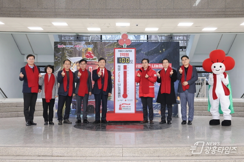 [광흥타임즈 = 구민지 기자] 의왕시가 12월 5일 시청 본관 1층 로비에서 ‘2025 사랑의 온도탑 제막식 및 환경‧사회‧투명(ESG) 나눔 기업 패 전달식’을 개최했다.