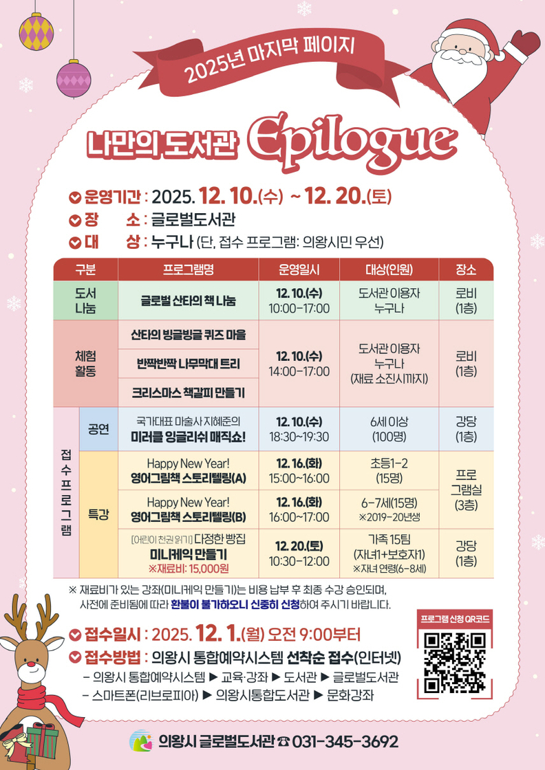 [광흥타임즈 = 구민지 기자] 의왕시 글로벌도서관(보식골로 30-10)에서는 올 한 해를 마무리하며 시민들이 풍성한 문화 향유 기회를 가질 수 있도록 연말 특별 행사'나만의 도서관 에필로그'를 12월 10일부터 20일까지 10일간 운영한다.