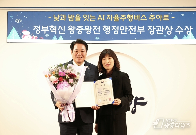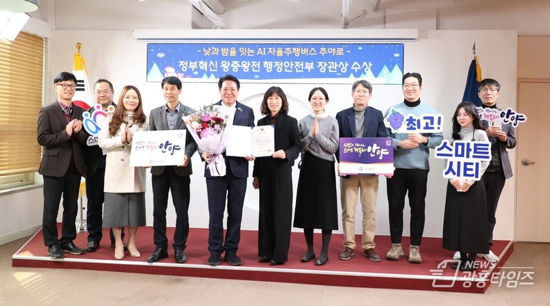 [광흥타임즈 = 조수제 기자] 안양시가 행정안전부 주관 ‘2025년 정부혁신 왕중왕전’ 민원서비스 혁신 분야에서 ‘낮과 밤을 잇는 인공지능 자율주행버스 주야로’ 혁신사례로 행정안전부장관상을 수상했다.