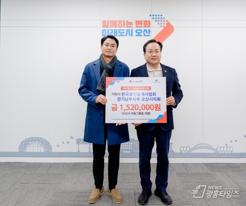 [광흥타임즈 = 조수제 기자] 오산시는 지난 15일 한국공인중개사협회 오산시지회가 그룹홈 아동 지원을 위한 성금 152만 원을 기탁했다고 밝혔다.