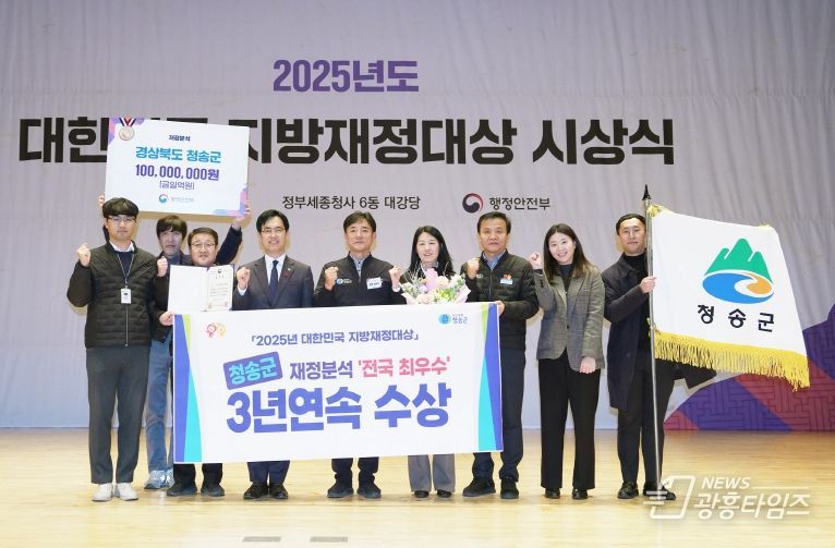 [광흥타임즈 = 조수제 기자] 청송군은 행정안전부가 실시한 지방자치단체 재정분석 평가에서 2023년 ‘우수’, 2024년 ‘최우수’에 이어 올해도 ‘최우수 자치단체’로 선정되며, 3년 연속 우수한 성과를 거두는 영예를 안았다.