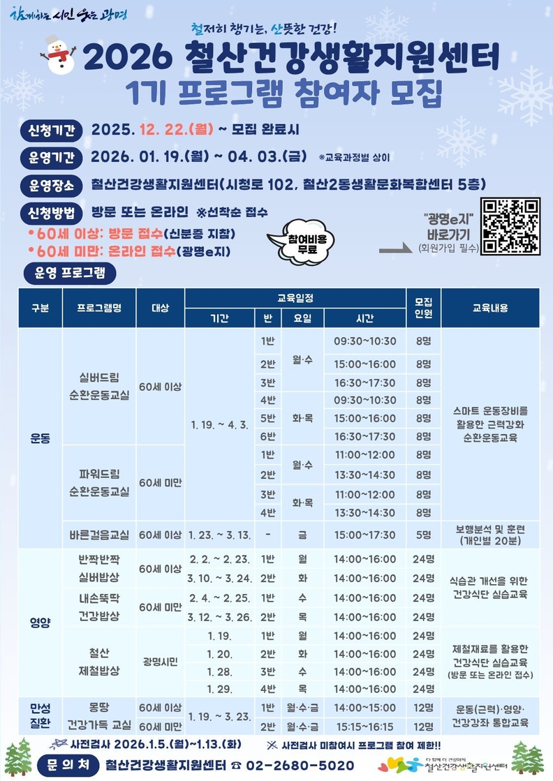 주요 프로그램은 ▲전자동 근력운동 장비(EGYM)를 활용한 개인 맞춤형 ‘튼튼드림 순환운동’ ▲건강한 식습관 형성을 위한 ‘철산영양가득교실’과 ‘철산제철밥상’ ▲조리실습·운동교육·건강강좌를 통합한 ‘몽땅 건강가득 교실’ 등이며, 내년 1월 19일부터 시작한다.