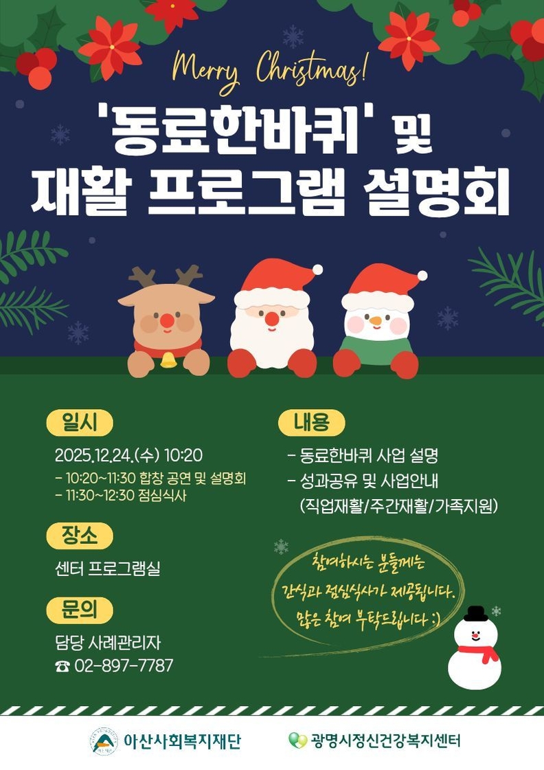 센터는 오는 24일 센터 프로그램실(광명시 오리로 1018, 5층)에서 아산사회복지재단 공모사업 ‘동료 한 바퀴’와 2025년 재활프로그램 평가회 및 2026년 프로그램 설명회를 개최한다.