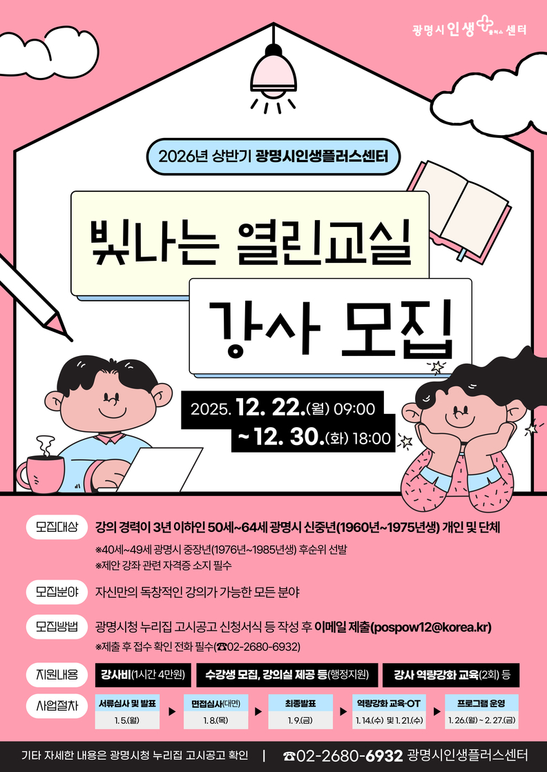 서류심사와 면접을 통해 선발된 강사는 2026년 1월 26일부터 2월 27일까지 자신의 전문 분야를 바탕으로 제안한 강좌를 광명시인생플러스센터에서 총 4회 진행하게 된다. 강의료는 시간당 4만 원 수준이다.