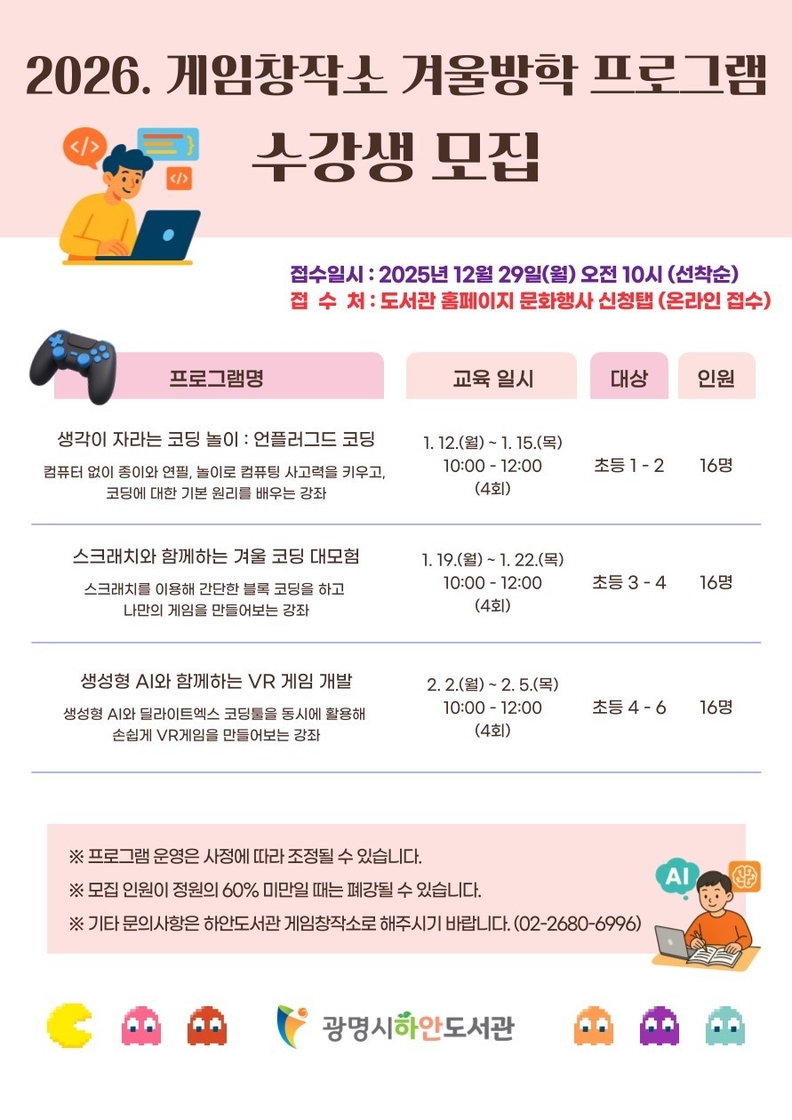 교육과정은 2026년 1월 12일부터 2월 5일까지 운영하며, ▲‘생각이 자라는 코딩놀이: 언플러그드 코딩’ ▲‘스크래치와 함께하는 겨울 코딩 대모험’ ▲‘생성형 AI와 함께하는 VR 게임 개발’ 등 총 3개 과정으로 진행한다.