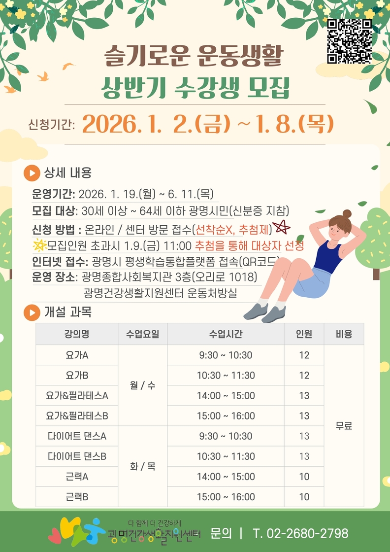 [광흥타임즈 = 조수제 기자] 광명시 광명건강생활지원센터는 새해를 맞아 시민들의 건강한 생활습관 형성과 만성질환 예방을 위해 2026년 상반기 ‘슬기로운 운동생활’ 운동 프로그램 참여자를 모집한다.