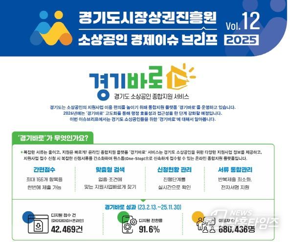 [광흥타임즈 = 조수제 기자] 경기도시장상권진흥원은 22일, 도내 소상공인의 행정 편의와 정보 접근성을 높이기 위해 운영 중인 경기도 소상공인 종합지원 서비스 ‘경기바로’의 현황과 향후 개선 방향을 담은 「경기도 소상공인 경제 이슈 브리프 VOL.12」을 발간했다고 밝혔다.