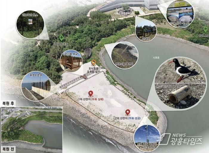시흥시가 철새도래지 서식처 조성사업에 2년 연속 선정돼 추진한 시화MTV ‘검은머리물떼새 서식지 조성사업’은 2025년 제25회 자연환경대상 기후에너지환경부장관상을 수상하며 그 생태복원 역량을 인정받았다. 시는 (사)시화호지속가능파트너십과 협력해 이번 사례를 생태ㆍ환경교육 프로그램과 연계 발전시켜 나가고 있다.