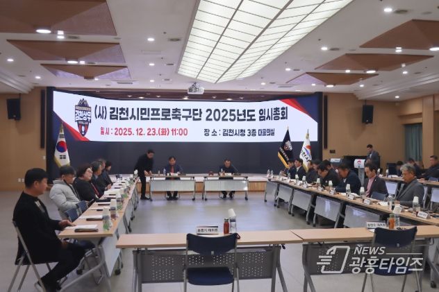 김천상무프로축구단이 12월 23일 오전 11시, 김천시청 3층 대회의실에서 2025년도 임시총회를 개회했다. 임시총회에는 배낙호 구단주, 이재하 대표이사, 김천시체육회 최한동 회장, 여영각 후원회장을 비롯한 대의원과 이사들이 자리했다.