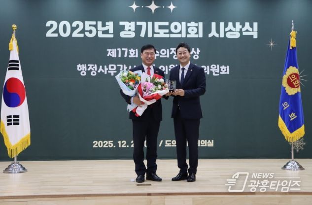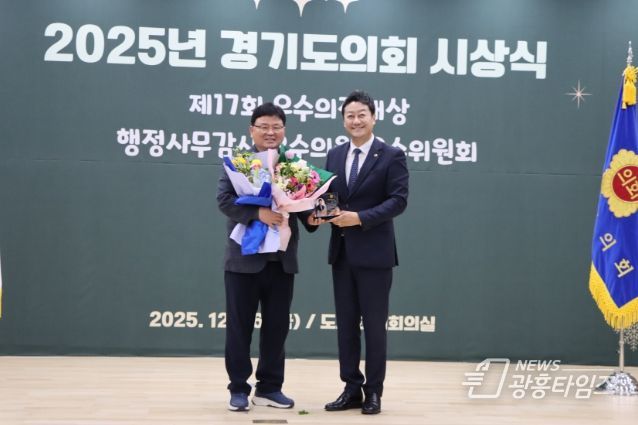 [광흥타임즈 = 조수제 기자] 경기도의회 교육기획위원회 이택수 의원(국민의힘, 고양8)과 성기황 의원(더불어민주당, 군포2)이 26일 열린 2025년 경기도의회 시상식에서 ‘2025년 행정사무감사 우수위원’으로 선정됐다.