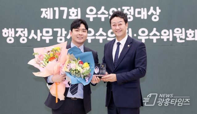 [광흥타임즈 = 조수제 기자] 경기도의회 정동혁 의원(더불어민주당, 고양3)이 26일 경기도의회 대회의실에서 열린 ‘2025년 행정사무감사 우수의원 시상식’에서 우수의원으로 선정되어 수상하는 영예를 안았다.