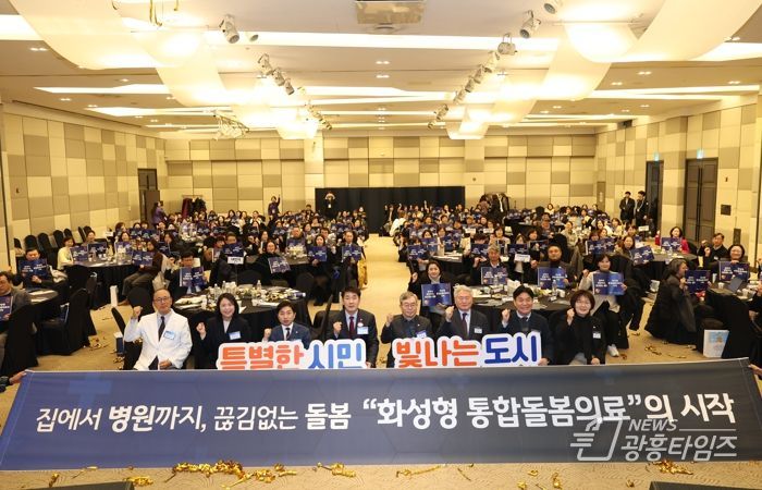 [광흥타임즈 = 구민지 기자] 화성특례시가 지난 26일 푸르미르호텔에서 2026년 '돌봄통합지원법' 시행에 대비해 지역병원 기반 돌봄 의료의 비전과 방향을 공유하기 위한 ‘돌봄의료센터 비전선포식 및 심포지엄’을 개최했다.