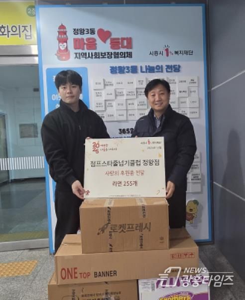 [광흥타임즈 = 조수제 기자] 점프스타줄넘기클럽 정왕점은 지난 12월 29일 정왕3동 지역사회보장협의체를 찾아 저소득 결식 우려 가구를 위한 라면 255개를 전달했다. 이번 후원은 학원생들이 어려운 이웃을 돕기 위해 직접 라면을 모아 마련한 것으로, 나눔의 의미를 더했다.