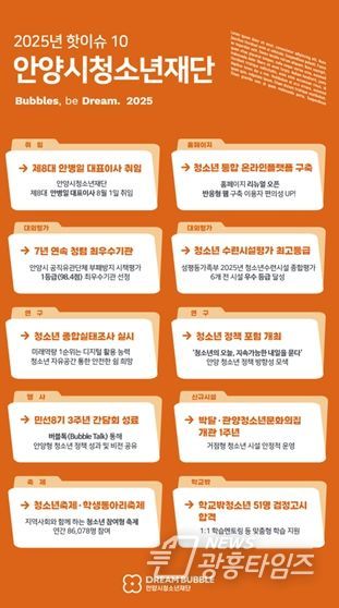[광흥타임즈 = 조수제 기자] 안양시청소년재단은 올 한 해를 돌아보는 ‘2025년 안양시 청소년재단 핫이슈 10’을 선정하고, 2025년 청소년 정책 컨트롤타워로서의 기능을 강화해 청소년 체감형 정책 성과를 거뒀다고 30일 밝혔다.