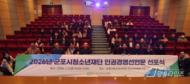 [광흥타임즈 = 조수제 기자] 군포시청소년재단은 2026년 1월 2일, 군포시청소년수련관 4층 청소년어울림 극장에서 전 직원 대상 인권경영 선언문 선포식을 개최했다. 이번 행사는 재단 임직원 모두가 참여하여, 새해를 맞아 조직 내 인권경영 실천 의지를 공유하고 상호 존중과 인권 존중의 문화를 강화하기 위해 마련됐다.