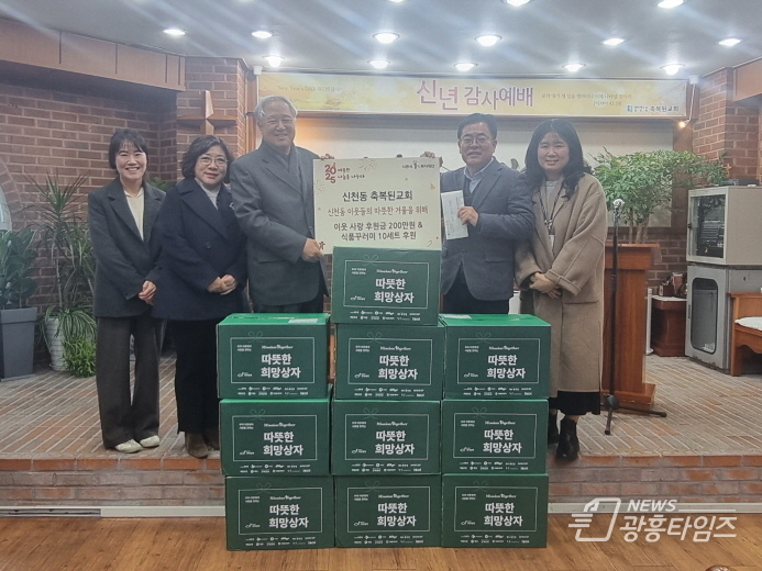 [광흥타임즈 = 조수제 기자] 시흥시 신천동 행정복지센터에 지난 1월 5일 신천동 축복된교회가 방문해 성탄 감사헌금 200만 원과 희망상자(식품꾸러미) 10개를 전달하며 지역사회에 이웃 사랑을 실천했다.