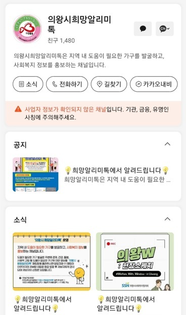 의왕시 관계자는 “‘희망알리미톡’은 주변 이웃을 살피고자 하는 시민들에게 중요한 소통의 통로로 자리 잡을 것”이라며 “마음 따뜻한 이들의 관심과 참여로 채널이 더욱 활성화되길 바란다”고 밝혔다.