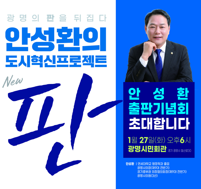 [광흥타임즈 = 조수제 기자] 광명의 판을 뒤집는 도시혁신 프로젝트가 시작됐다. 광명시장 출마를 준비 중인 안성환 광명시의원이 오는 27일 오후 6시 광명시민회관에서 출판기념회 '판 : 안성환의 도시혁신 프로젝트'(이하 ‘판’)을 개최한다. 이를 계기로 광명시장 선거를 향한 안성환 의원의 행보도 본격화될 전망이다.