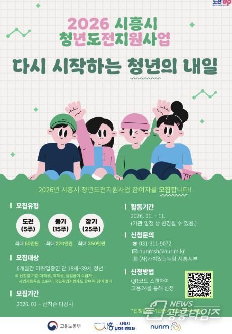 [광흥타임즈 = 조수제 기자] 시흥시는 취업과 사회 진출에 어려움을 겪고 있는 청년들의 재도전을 지원하기 위해 ‘2026년 청년도전지원사업’ 참여자 156명을 모집한다.