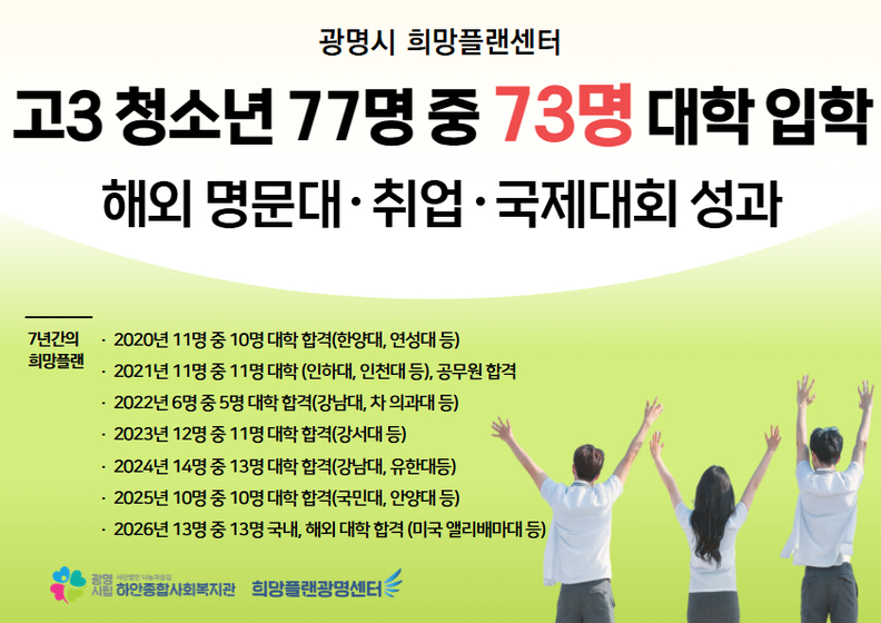 그 결과 2020년부터 2026년까지 희망플랜광명센터를 통해 지원받은 77명의 고등학교 3학년 청소년 가운데 73명이 대학에 합격했다. 취업 성공과 전문 분야 진출, 국제대회 입상 등 다양한 성과도 나타났다.