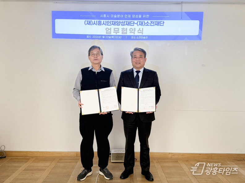 [광흥타임즈 = 조수제 기자] 시흥시는 (재)시흥시인재양성재단이 지난 1월 22일 시흥시 미술 분야 유망 인재를 발굴하고 예술 교육 기반을 확대하기 위해 소전재단과 ‘미술 분야 장학생 발굴 및 프로그램 운영을 위한 상호협력 협약’을 체결했다고 밝혔다.