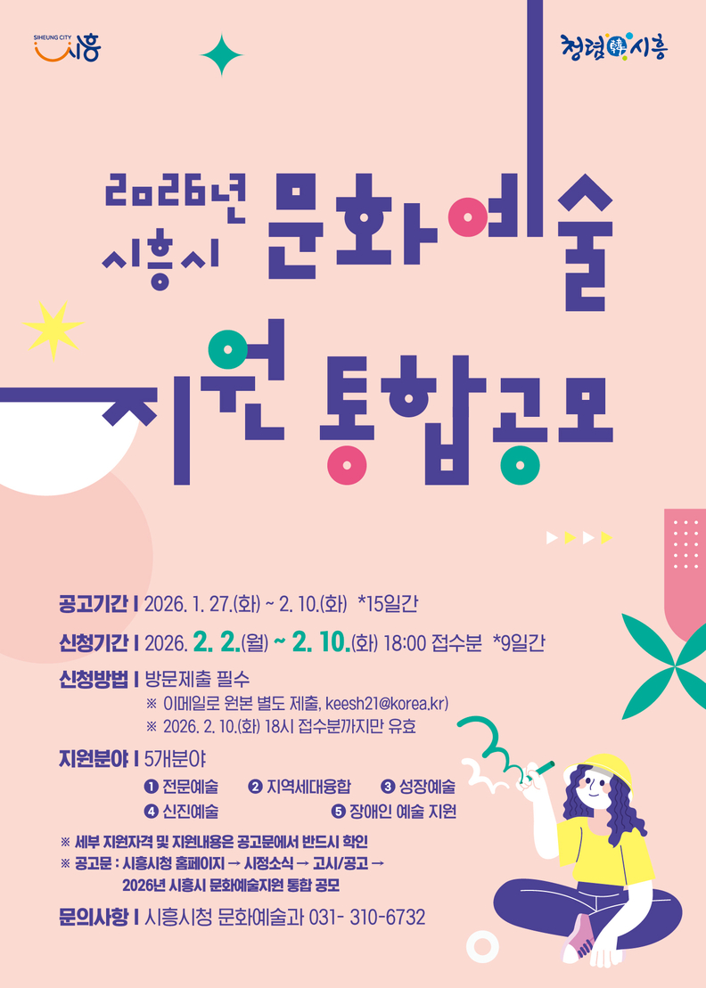공고 기간은 1월 27일부터 2월 10일까지이며, 신청 기간은 2월 2일부터 10일 오후 6시까지다. 참여를 희망하는 단체 및 개인은 시흥시청 문화예술과에 직접 방문해서 신청해야 하며, 해당 기간 내에 원본 동일 서류를 담당자 전자우편(keesh21@korea.kr)으로 별도 제출해야 한다.