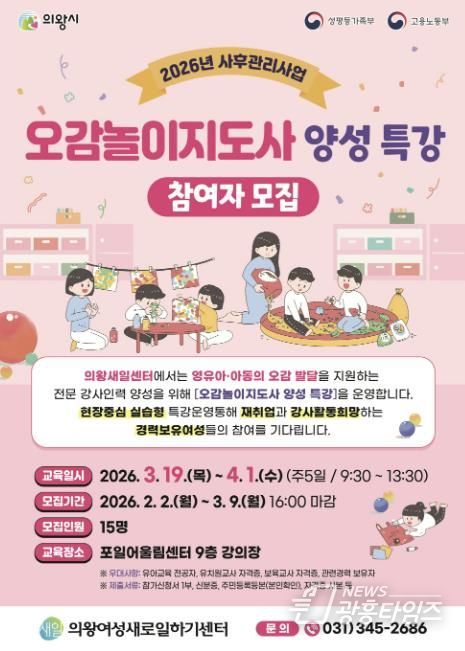 [광흥타임즈 = 구민지 기자] 의왕시 여성새로일하기센터가 '오감놀이지도사 양성 특강'의 교육생을 모집한다.