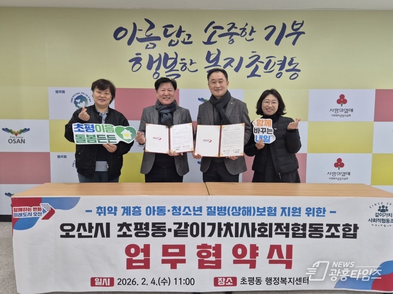 [광흥타임즈 = 조수제 기자] 오산시 초평동 행정복지센터는 지난 4일 지역 내 차상위계층 청소년과 아동의 건강한 성장 지원과 의료비 부담 완화를 위해 같이가치사회적협동조합과 질병(상해)보험료 지원을 위한 업무협약을 체결했다고 밝혔다.