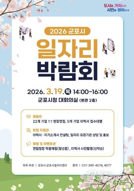 [광흥타임즈 = 조수제 기자] 군포시는 오는 3월 19일 오후 2시부터 시청 대회의실에서 ‘2026년 군포시 일자리 박람회’를 개최함에 따라 2월 10일부터 2월 27일까지 박람회에 참여할 기업체를 모집한다.