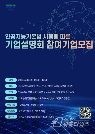 [광흥타임즈 = 조수제 기자] 경기도가 지난 1월 22일 시행된 ‘인공지능 기본법’에 대한 도내 기업들의 이해를 돕기 위해 10일 오후 2시 판교 경기AI캠퍼스에서 AI 기업 대상 설명회를 개최한다.