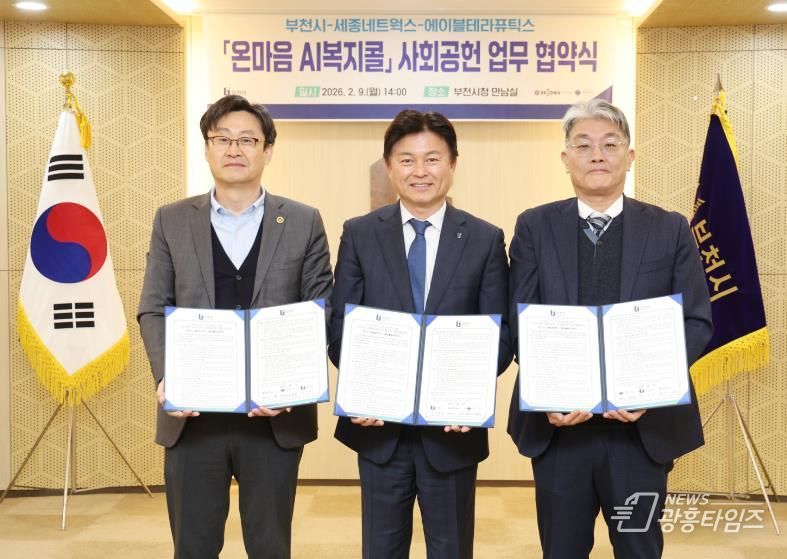 [광흥타임즈 = 조수제 기자] 부천시는 지난 9일 시청 만남실에서 세종네트웍스와 에이블테라퓨틱스와 함께 ‘온마음 AI복지콜’ 사회공헌 업무 협약을 체결했다.