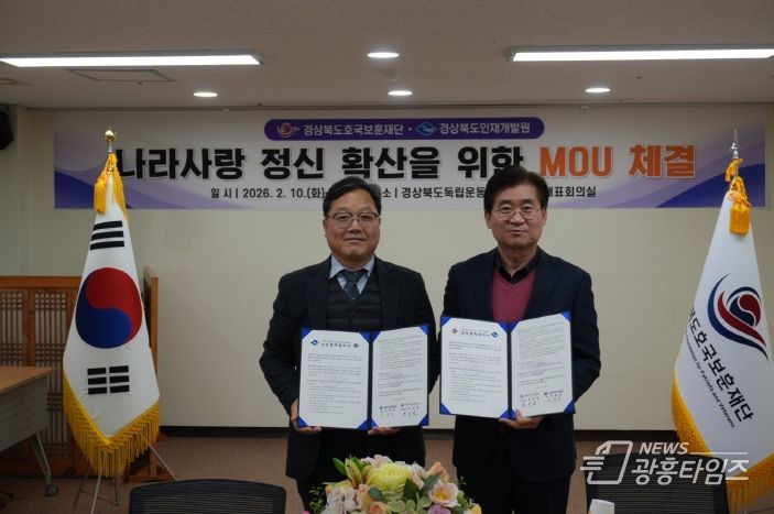 [광흥타임즈 = 조수제 기자] 경상북도인재개발원(원장 우광진)과 (재)경상북도호국보훈재단(대표이사 한희원)은 2월 10일 오후 2시, (재)경상북도호국보훈재단 국민대표회의실에서 나라사랑 정신을 계승·확산하기 위한 업무협약(MOU)을 체결했다.