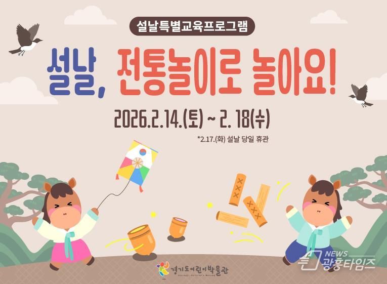 [광흥타임즈 = 조수제 기자] 경기문화재단 경기도어린이박물관은 설날을 맞이하여 2026년 2월 14일부터 2월 18일까지 설날 특별프로그램 '설날, 전통놀이로 놀아요!'를 운영한다. 설 연휴 동안 박물관을 방문하는 어린이와 동반 가족을 위해 가족 간의 유대감을 높일 수 있는 전통문화 체험프로그램 3종을 준비했다.