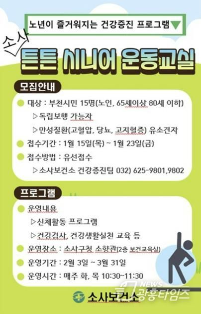 [광흥타임즈 = 조수제 기자] 부천시는 겨울철 활동량이 줄어들기 쉬운 65세 이상 어르신의 기초체력 증진과 건강한 생활 습관 형성을 위해 ‘튼튼 시니어 운동교실’을 운영하고 있다. 현재 1기 프로그램이 3월 31일까지 매주 화요일과 목요일, 소사어울마당 소향관에서 진행 중이다.