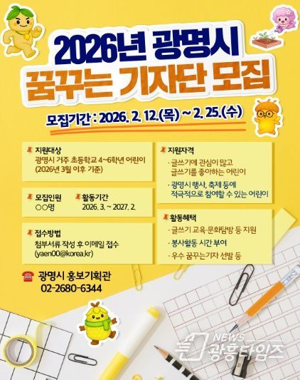[광흥타임즈 = 조수제 기자] 광명시가 어린이의 시각으로 지역사회의 생생한 소식을 전할 ‘꿈꾸는기자단’ 신규 기자를 오는 25일까지 모집한다.