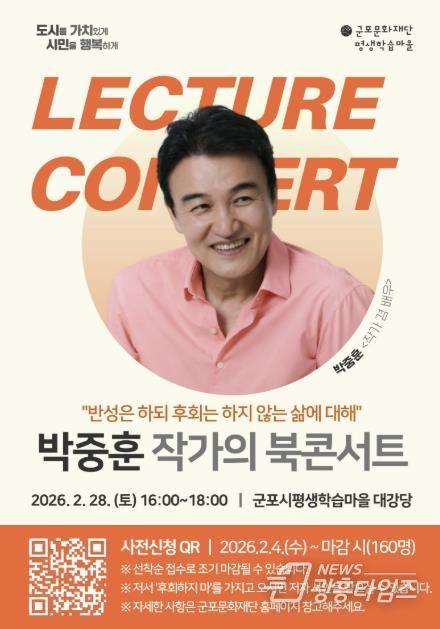 [광흥타임즈 = 조수제 기자] 군포문화재단 군포시평생학습마을은 2월 28일 렉처콘서트의 일환으로 북콘서트를 개최한다. 올해 3회를 맞이하는 렉처콘서트는 시민이 참여하여 즐길 수 있는 평생학습 대표 행사로서 자리매김하고 있다.
