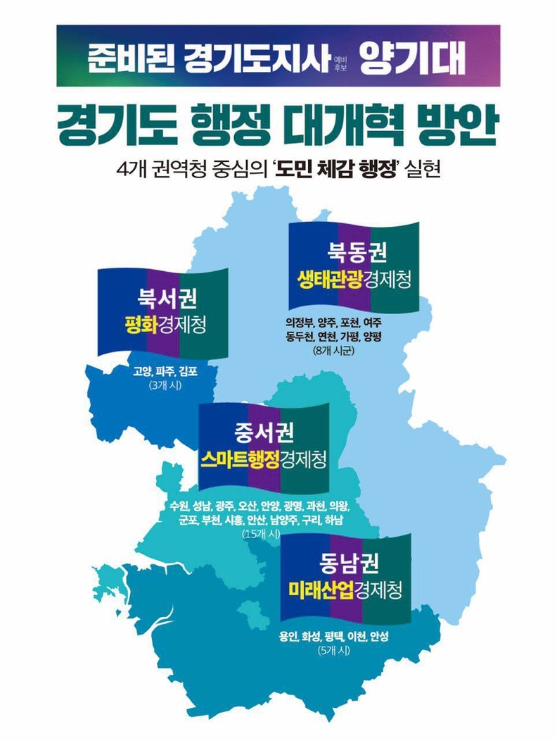 [광흥타임즈 = 조수제 기자] 양기대 더불어민주당 경기도지사 예비후보가 경기도의 행정 체계를 4개 권역청 중심으로 재편하는 ‘경기도 행정 대개혁’ 구상을 강화했다.