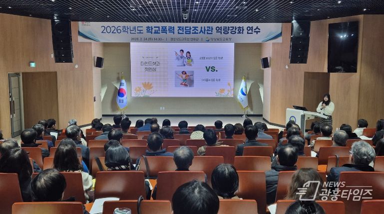 [광흥타임즈 = 조수제 기자] 경북교육청(교육감 임종식)은 24일 본청 행복지원동 연화관에서 도내 학교폭력 전담조사관 150명과 지역별 업무 담당자 22명 등 총 170여 명이 참석한 가운데 ‘2026학년도 제로센터 학교폭력 전담조사관 역량 강화 연수’를 개최했다고 밝혔다.