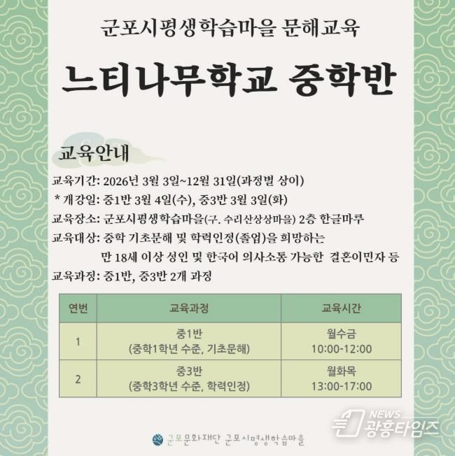[광흥타임즈 = 조수제 기자] 군포문화재단 군포시평생학습마을은 지난 3일 성인 문해교육 프로그램 ‘느티나무학교’를 개강했다고 밝혔다.