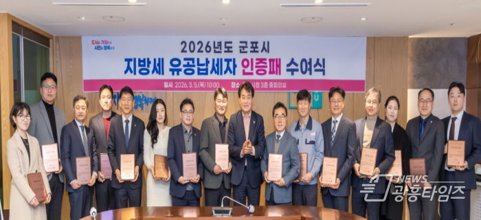 [광흥타임즈 = 조수제 기자] 군포시 하은호 시장은 3월 5일 지방세를 성실하게 납부하여 지방재정 확충에 기여한 유공납세자 15개 법인에게 ‘유공납세자 인증패’를 수여하고 감사의 마음을 전했다.