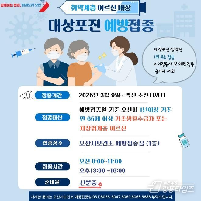 김태숙 오산시보건소장은 “이번 무료 예방접종 지원사업을 통해 경제적 부담으로 예방접종을 받지 못했던 어르신들이 건강한 노후를 보내시길 바란다”며 “앞으로도 취약계층의 건강권 보장을 위해 다양한 보건의료 지원사업을 지속적으로 확대해 나가겠다”고 말했다.