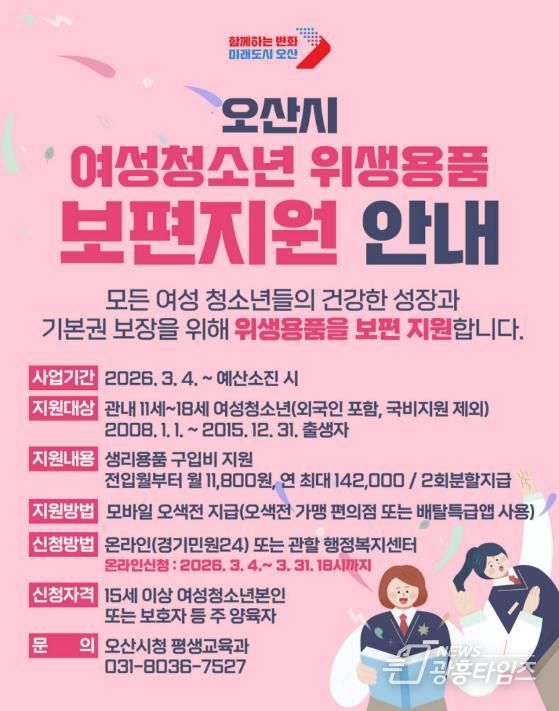 [광흥타임즈 = 조수제 기자] 오산시는 관내 11세부터 18세까지의 여성청소년을 대상으로 '여성청소년 위생용품 보편지원 사업'을 추진한다고 밝혔다.