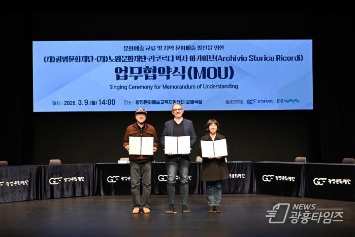 [광흥타임즈 = 조수제 기자] (재)광명문화재단은 3월 9일 오후 2시 광명극장에서 (재)노원문화재단, 리코르디 역사 아카이브(Archivio Storico Ricordi)(이하 리코르디)와 ‘문화예술 교류 및 지역 문화예술 발전’을 위한 업무협약(MOU)을 체결했다고 밝혔다.