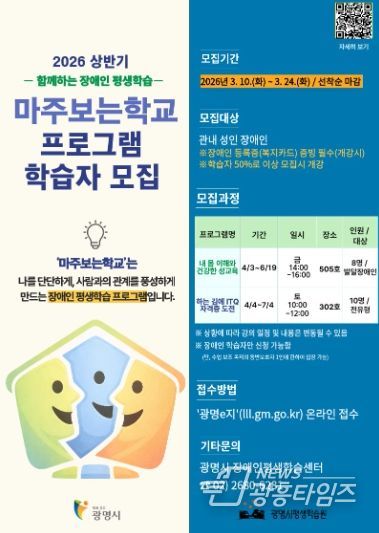 [광흥타임즈 = 조수제 기자] 광명시 평생학습원은 장애인 학습자의 자기 이해와 사회 참여 역량 강화를 위한 평생학습 프로그램 ‘마주보는학교’의 상반기 수강생을 오는 24일까지 모집한다.