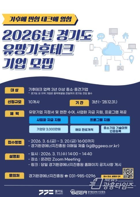 [광흥타임즈 = 조수제 기자] 경기도와 경기환경에너지진흥원이 기후위기 대응을 선도할 혁신 기술 보유 기업을 발굴하기 위해 오는 3월 20일까지 ‘2026년 경기도 유망 기후테크 기업’ 10곳을 모집한다.