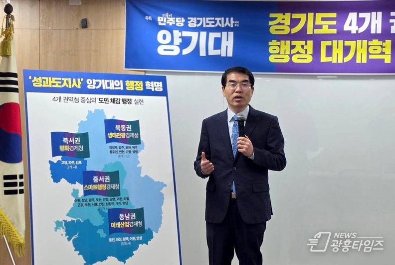 [광흥타임즈 = 조수제 기자] 양기대 더불어민주당 경기도지사 예비후보는 17일 수원 본청 중심의 경기도 행정 구조를 4개 권역청 중심으로 바꾸는 행정 대개혁 실행 로드맵을 발표했다.