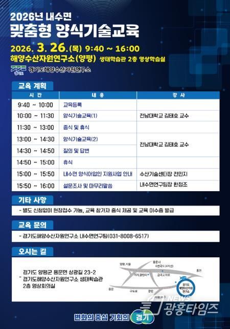 [광흥타임즈 = 조수제 기자] 경기도해양자원연구소는 오는 26일 양평에 있는 연구소 생태학습관에서 내수면 양식 어업인의 역량 강화를 위한 양식기술교육을 실시한다.