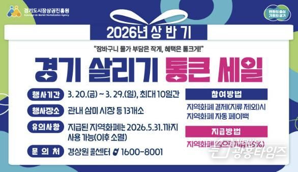 [광흥타임즈 = 조수제 기자] 시흥시는 고물가로 위축된 민생경제에 활력을 불어넣고 소상공인의 매출 증대를 돕기 위해 오는 3월 20일부터 29일까지 관내 전역에서 ‘2026년 상반기 경기 살리기 통큰 세일’을 개최한다.
